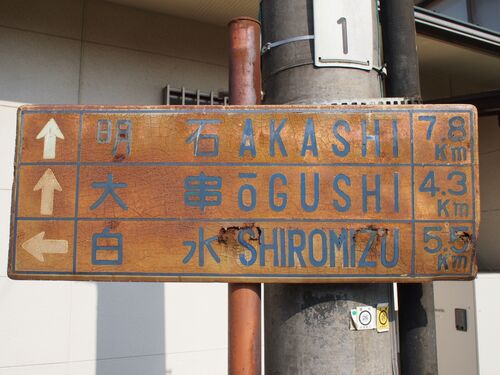 2017年7月30日 広島県大崎上島町にて採集 ◇個体数が少ない103-A in 瀬戸内の離島。胸熱です。 ◇単柱式ですが、板面が標柱の最上部にありません。 ◇生活道路の一角にぽつんと立っています。 ◯白看の種類:103-A「↑明石7.8Km/↑大串4.3Km/←白水5.5Km」(単柱式…